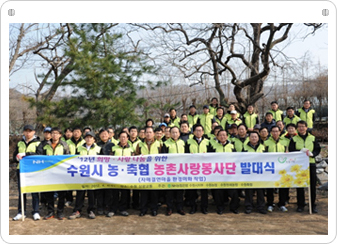 수원농협, NH농협 수원시지부, 수원축산농협, 수원원예농협 임직원 60여명이 광교산에 위치한 상광교동의 농가를 찾아 수원시 농축협 농촌사랑 봉사대 발대식을 갖고 환경정화 운동을 실시하였습니다.