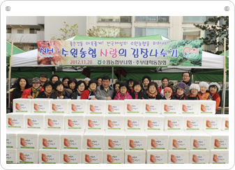 수원농협 부녀회 및 주부대학 동창회는 관내 사회복지기관 및 시설에 김장나누기 행사를 통하여 김치 200박스(10kg)를 전달 하는 이웃사랑을 실천하였습니다.