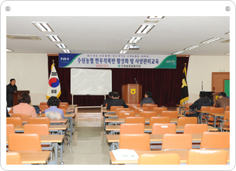 우리농협 한우작목반원들의 사양관리 제고 및 고품질 한우 생산을 위하여 외부강사로부터 한우생존에 관련한 교육을 받았습니다.