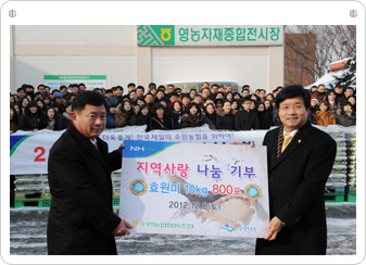 오목천동 경제사업장에서 임직원 및 염태영 수원시장 등 200여명 이 참석한 가운데, 독거노인 및 소년소녀가장 등 사회소외계층에 쌀 10kg 1,000포(수원지역 800포, 화성지역 200포)를 전달하였습 니다.
