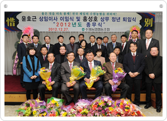 30여 년 동안 수원농협 발전을 위해 노력하신 윤호근 상임이사 이임식과 홍성호 상무 퇴임식을 갖았습니다. 또한 어느 때 보다 힘들었던 한해, 슬기롭게 헤쳐 나갔던 임직원이 한자리에 모여 다가오는 2013년을 새로운 각오로 맞이하고자 결의를 다짐했습니다.